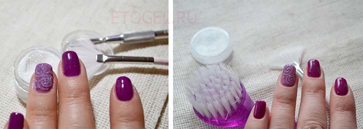 Используя специальную щеточку, смахнуть лишние частички, при необходимости сформировать узор также можно воспользоваться этой щеточкой.