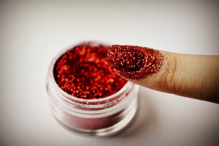 Вариант 4. Ноготь или его часть покрывается прозрачным лаком. После этого палец надо опустить в посуду с блестками. Они прилипнут к накрашенной части ногтя. Например, такой вариант очень удобный, если делать блестящий френч.