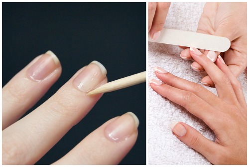 Задавшись вопросом, как делать сухой маникюр, сайт Beauty-Hands.ru советует: первым делом нужно придать ногтям желаемую форму при помощи наших двух пилочек. Проверяем качество работы, проведя по краю ногтя подушечкой пальца вверх-вниз. Если он гладкий, то можно продолжать делать сухой маникюр.