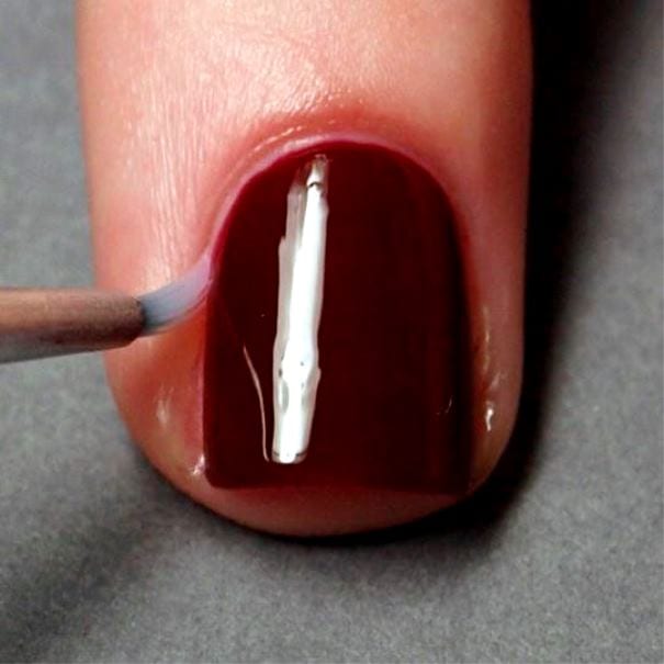 Лучше всего кисточку подносить не к корню вашего ногтя, а немного ниже (не стоит доходить до самого корня). Мимолетным движением по центру ногтевой пластины проведите линию вниз, а потом вверх. Такими же движениями выполняем еще две линии — справа и слева.