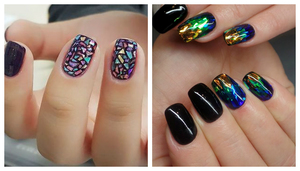Разбираясь, как сделать «Битое стекло» на ногтях, нужно понимать, что осколки этого материала на самом деле использоваться не будут, так недолго и травмироваться, нося подобное «украшение». Эффект мерцания достигается при помощи стилизации под стекло кусочков специальной фольги или полиэтилена, имеющего голографическое покрытие. Причем готовые, уже нарезанные «осколки», специально предназначенные для создания нейл-дизайна можно купить в специализированных торговых точках. Лучи солнца или ламп красиво отражаются и играют на их поверхности, создавая тот самый неповторимый эффект разбитого зеркала.