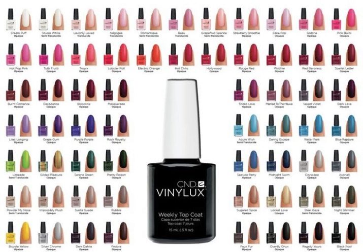 Среди всех оттенков Vinylux нашлось место и для остромодных спокойных «офисных» оттенков, и для заметных тёмных однотонных покрытий, и для самых ярких насыщенных и креативных цветов. Есть в коллекции Vinylux покрытия с различными эффектами (шиммеры, лаки-хамелеоны, матовые и сверкающие). Такой широкий выбор позволяет подобрать нужный маникюр на любой случай.