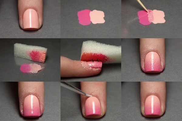 Существует два способа выполнения такого дизайна ногтей. Как вы уже поняли, маникюр губкой позволяет получить красивый градиент (плавный переход между цветами). Первый способ выполнения данного дизайна ногтей делается в таком порядке: