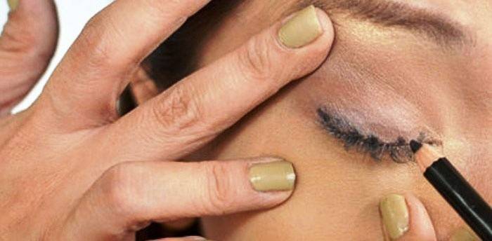При нанесении карандаша на нижнюю линию роста ресниц также нужно слегка оттягивать веко пальцами.