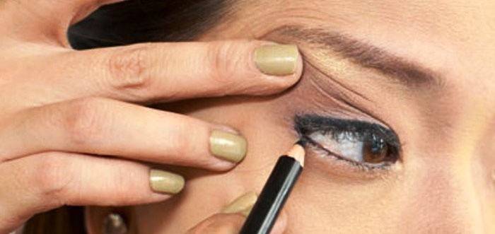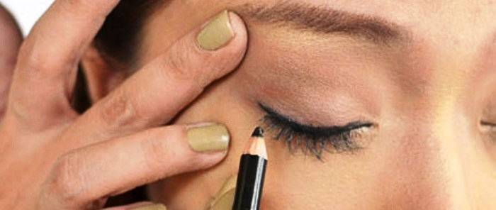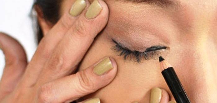 Прежде чем подводить контур глаз карандашом – следует немного оттянуть кожу верхнего века. Это позволит разгладить все неровности и маленькие морщинки, способные помешать при рисовании.