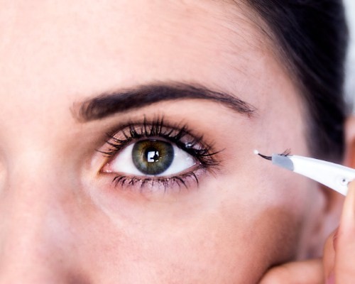 Чтобы приклеить накладные ресницы, следует нанести клей на их основание тонким слоем, уделив особое внимание краям, и подождать секунд 10-15, чтобы он успел схватиться. Цельные накладные ресница клеятся на кожу века максимально близко к линии роста собственных ресниц