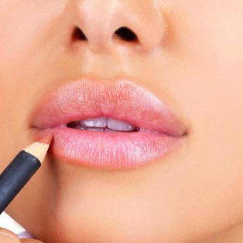 - Поверх белого или телесного карандаша проводят линию, повторяющую предыдущий контур. Используют оттенок, который подобран к помаде.