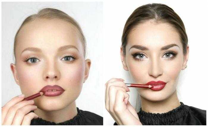 Основная цель в данном случае – красить губы так, чтобы они казались больше. Потребуется нанести на зону вокруг плотный тональный крем, консилер. Далее следуетнакрасить контур карандашом чуть отступая от естественной границы