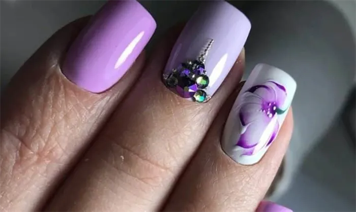 Очень оригинально смотрится следующий вариант маникюра с обычными лаками. Для осуществления идеи потребуется бледно-розовый лак, фиолетовый, прозрачный, простой карандаш с ластиком на конце и силовая кнопка-шарик, стразы и клей для ногтей по желанию. Когда все нужное под рукой, приступаем к исполнению инструкции: