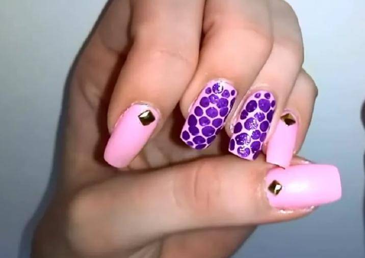 - С его помощью наносим на ногти безымянного и среднего пальцев фиолетовые горошины.