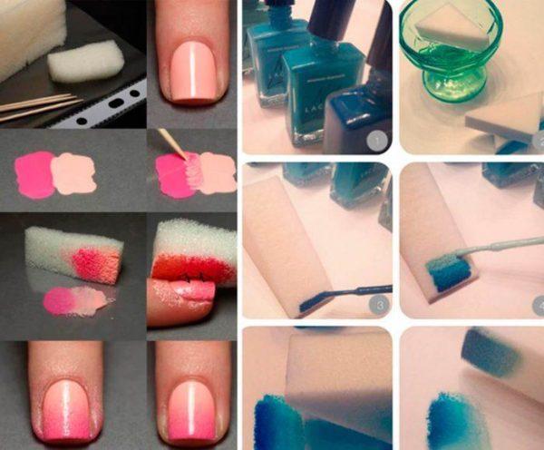 Градиент. Эта очень популярная в 2019 году модная тенденция легко выполнима не только в маникюрных салонах, но и дома. Выберете два или три цветных лака. Накапайте каждого на твердую поверхность. Чтобы лаки перемешались, проведите по их границам иголочкой. После, обмакните в получившееся пятно губку, а с нее переносите лак на ногти. По окончанию процесса покройте поверхность прозрачным топом. Все, красивый и модный маникюр готов!