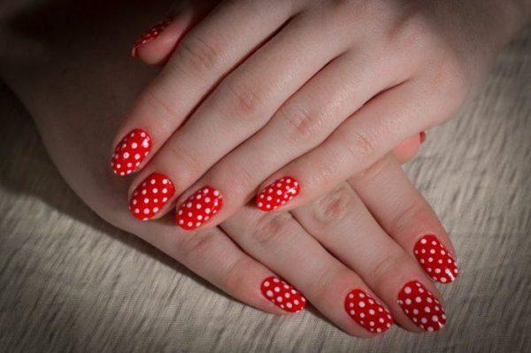 Маникюр в горошек будет идеально смотреться в черно-белом и красно-белом вариантах. А чтобы он держался дольше, не забудьте покрыть его сверху прозрачным топом.