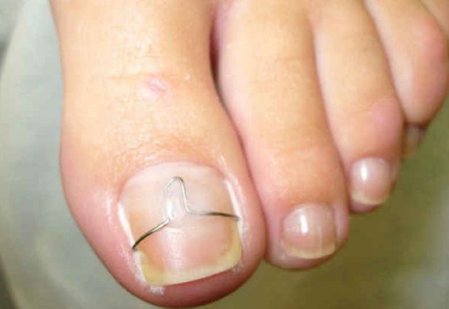 Коррекция формы ногтя пластинами и скобами проводится у детей старше шести лет на начальных стадиях вросшего ногтя простым курсом. Пластина или скоба надежно фиксируются перпендикулярно росту ногтя, боковые дуги или крючки на концах фиксируются на боковом крае, вынимают его из-под ногтевых валиков и не допускают внутреннего разрастания. Из многочисленных устройств, применяемых у детей, применялись «BS Standard», «Oniklip» и скоба Фрейзера.