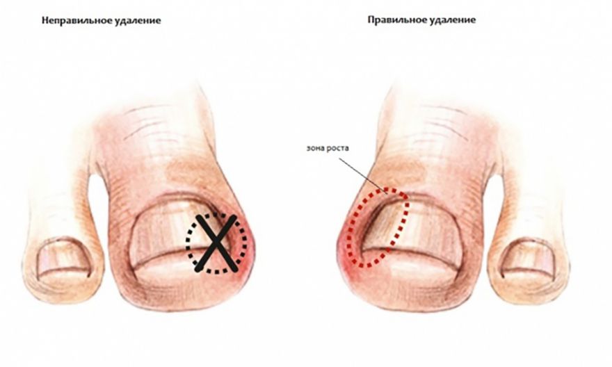 Хирургическая операция проводится наиболее щадящим способом. По возможности оперирующий хирург удаляет не всю ногтевую пластину, а всего лишь край ногтя. Полное восстановление наступает на 15-20 сутки после оперативного вмешательства. Детям до десяти лет такие манипуляции проводят под общим наркозом, для старших пациентов используют местную анестезию.