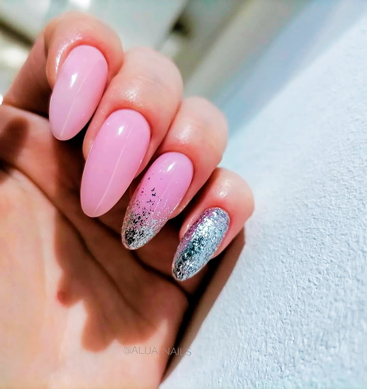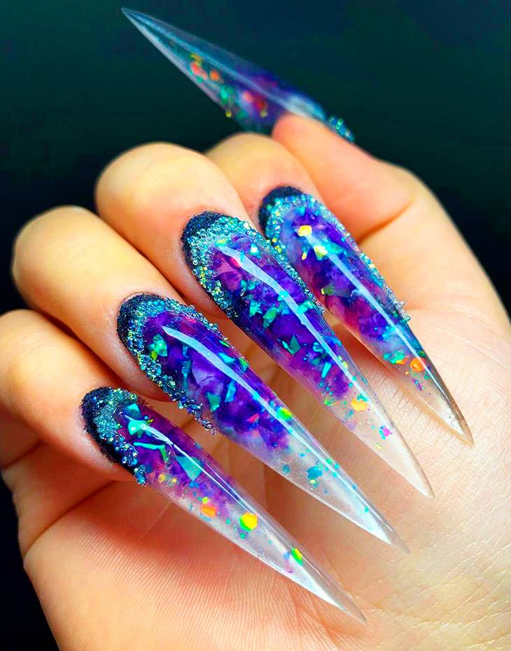 Длинные ногти позволяют сделать покрытие ноготков лаком тёмного цвета с блёстками, при этом лунку можно не закрашивать. Ещё один тренд сезона – маникюр в стиле «битое стекло». По-другому его ещё называют зеркальным. При этом дизайне лунку или вообще не закрашивают, или покрывают прозрачным лаком. На ноготок накладывают кусочки фольги или голографической пленки. Сверху маникюр покрывают топом.