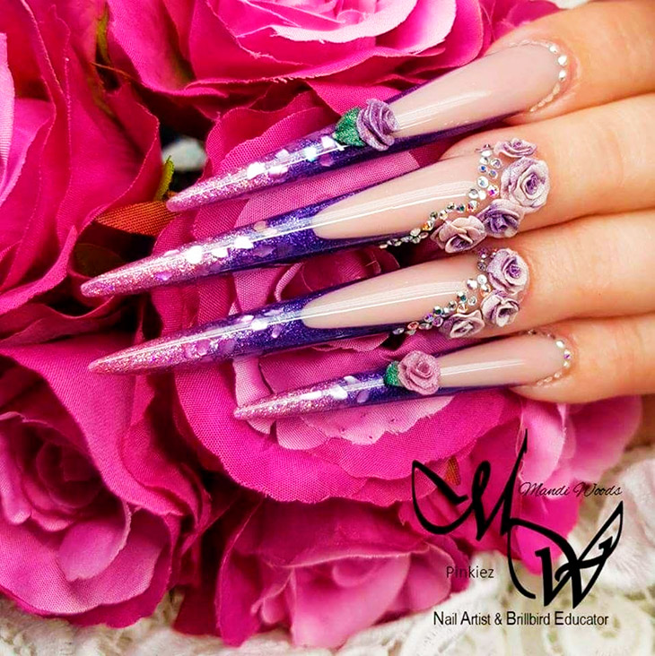 При данном дизайне на ногти выкладывается объемный рисунок, который может быть создан либо специальным гелем, либо при помощи полимерной глины, акриловых пудр, или, что встречается чаще всего, специальных слайсов и страз.