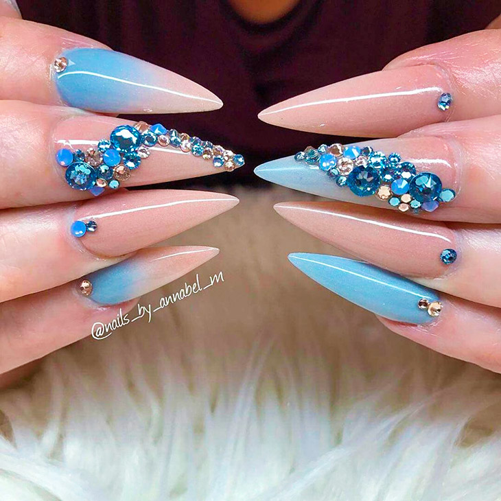 У острых ногтей длинная пластина и заостренный кончик. Одна из наиболее удачных форм для дизайна. Выигрышно будет смотреться любой маникюр. В этом году актуальна классика, нюдовые цвета, френч, для вечернего образа украшение стразами и фольгой.
