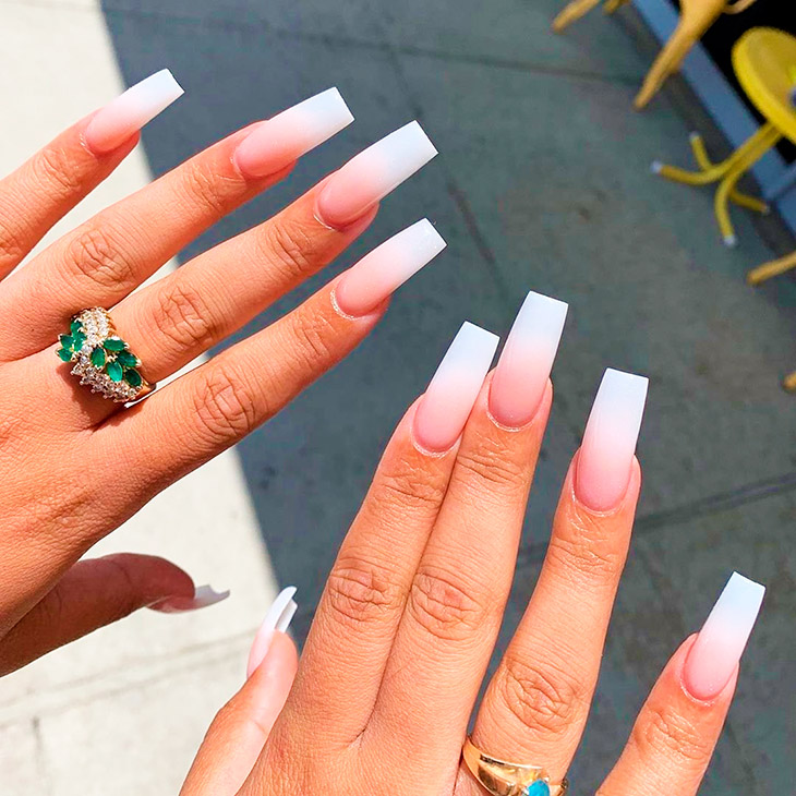 Форму балерина для длинных ногтей выбирают нежные и в тоже время смелые женщины. Пуанты напоминают трапецию, придают обладательнице легкую загадочность.