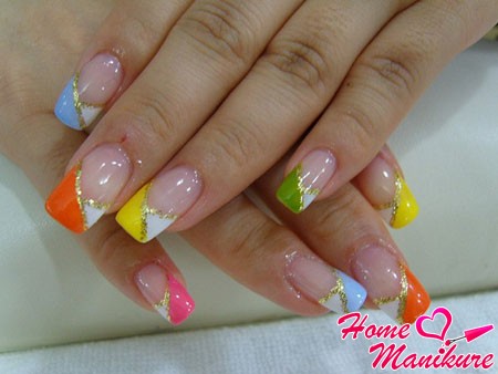 Классический французский маникюр, выполненный на нарощенных гелевых ногтях, поражает своей эстетической привлекательностью и завершенностью. Солидная длина искусственных кончиков – прекрасное поле для творчества мастера, который может воплотить в жизнь любые ваши идеи. В 2014 году все еще весьма популярен и востребован французский дизайн с классической белой линией улыбки. Многие девушки предпочитают френч в разноцветных красках или в стиле «Шеврон», когда свободный край выделяется не в форме полумесяца, а в виде буквы V. Также весьма эффектно и стильно смотрится асимметричный французский маникюр. Границ для творчества при создании френча нет! Убедитесь в этом сами, наслаждаясь просмотром великолепных фото, на которых представлены наиболее интересные и элегантные модные новинки французского нейл-арта этого сезона.