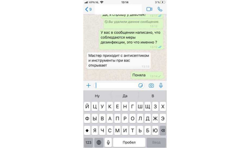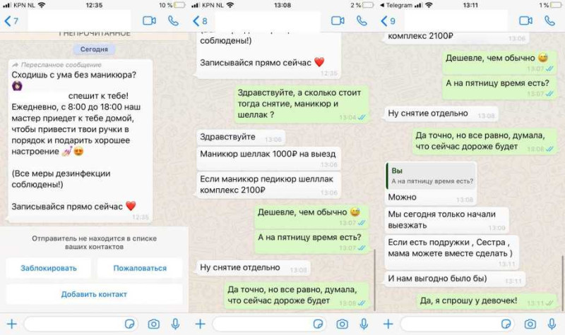 В стоимость входит весь комплекс услуг – выезд на дом, маникюр, снятие. Можно пригласить к себе маму и подружек – вместе веселее и выгоднее, утверждает мастер. Хотя в первом сообщении в скобках было указано – все меры дезинфекции соблюдены. Мы решили выяснить, о чем же идет речь?