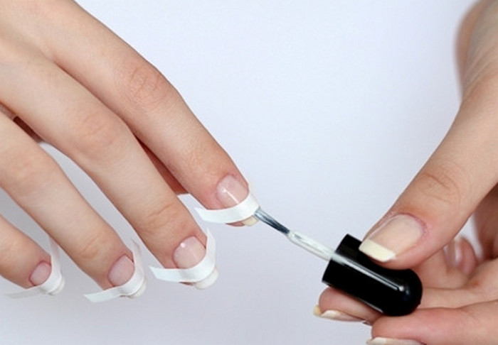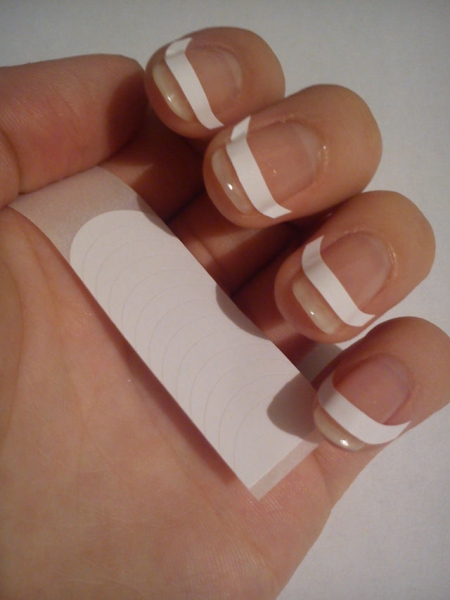 Если у вас нет под рукой трафарета, то можно воспользоваться самым обычным скотчем. Впрочем, если с первым все легко и просто, то со скотчем придется изрядно потрудиться, ведь для начала следует вырезать улыбку правильной формы. Для этого ногтевая пластина визуально подразделяется на две равные части, полоска фиксируется ровно к его середине, а затем вырезается полумесяц так, чтобы его форма была одинаковой по форме и размеру с обеих сторон.