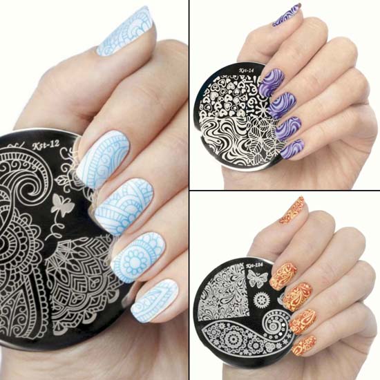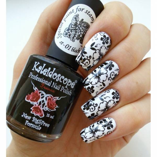 Что касается штампования, то здесь все просто – ногти нужно накрасить основным лаком, а затем с использованием специальных печатей нанести контрастный рисунок. При наличии художественных способностей можно создать такой штампик самому – для этого на пленку наносится лак, зубочисткой ему придается требуемый узор и накладывается на подготовленный ноготок.