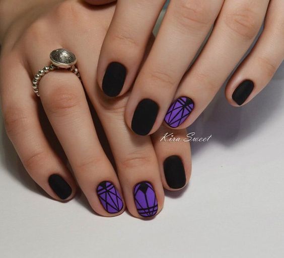 Геометрические узоры необязательно должны быть мелкими и едва ли различимыми. Они могут занимать ½ или ¼ всей ногтевой пластины. Покройте ноготь, скажем, черной базой, а на одну его половину нанесите плотное золотистое или серебристое покрытие. Этот маневр поможет вам не только повысить визуальную привлекательность ваших ногтей, но и сделать их несколько «длиннее»