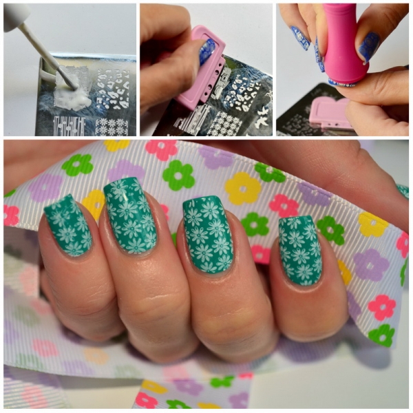 - стемпинг – здесь готовые рисунки контрастного цвета попросту штампуются на ногтях, окрашенных базовым оттенком.