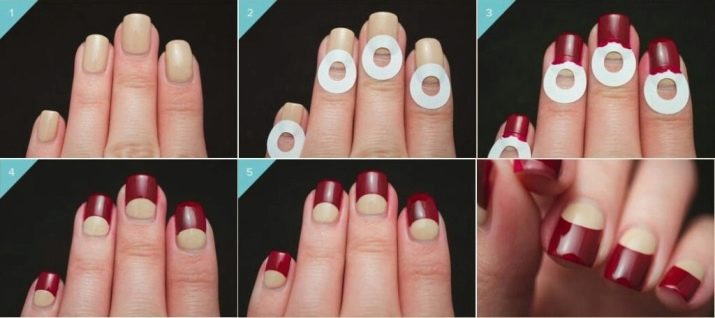 Такой вариант требует гораздо больше времени, однако он позволяет регулировать глубину полумесяца и его форму, да и приобрести скотч намного проще, чем искать трафарет, который продается далеко не в каждом магазине. Аналогично делается лунный маникюр, однако в этом случае липкой лентой закрывается нижняя полукруглая часть ногтевой пластины.