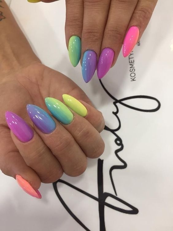 Очень эффектно смотрится, если накрасить ногти разными цветами радуги на обеих руках. Радужный эффект можно создать как за счет традиционного сочетания оттенков, так и сочетая всевозможные сочные цвета. Просто накрасьте каждый ноготок своим цветом и наслаждайтесь. Кстати, оттенки могут быть насыщенными или пастельными по желанию. Маленькая хитрость: яркий радужный маникюр будет выделяться лучше, если Вы наденете одежду приглушенных цветов, делая уклон исключительно на ногти.