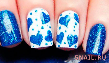 Чтобы сделать двухцветный образ тематическим, можно добавить к лакам изюминки. Например, ко дню влюбленных сделать на белом фоне синие сердечки. На выступление любимой группы можно сделать зарисовку клавиш, скрипичного ключа.