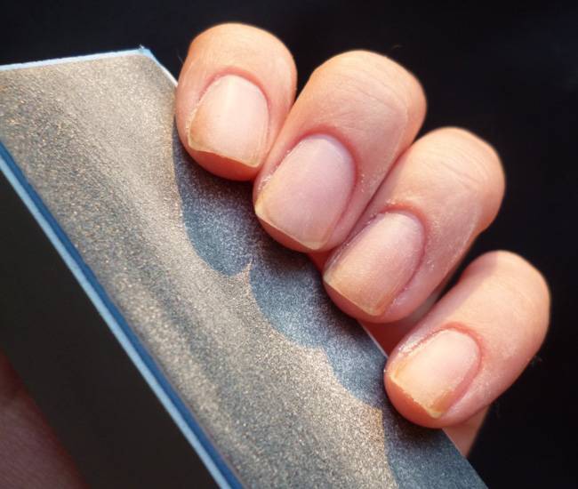 - Чтобы лак прочно держался, снимите с ногтевой пластины глянцевый слой посредством баффа с высокой абразивностью;