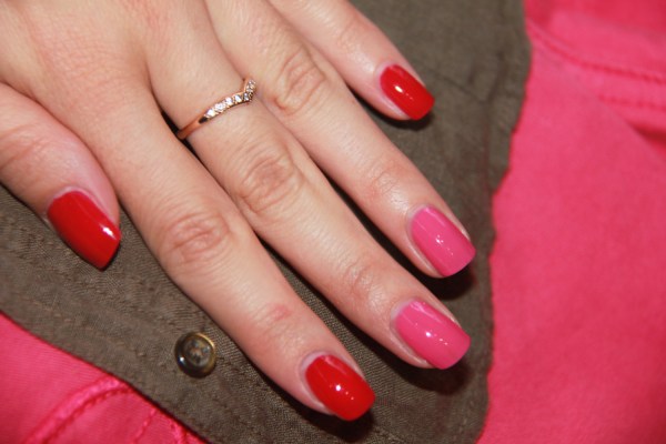 - Можно покрасить наряду с безымянным пальцем еще и мизинец. Берутся два цвета разных оттенков. Например, неплохо сочетаются малиновый и коралловый цвета. Мизинец и безымянный палец красятся малиновым цветом, а остальные ногти – коралловым. На другой руке можно поменять оттенки.