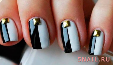 Геометрические узоры необязательно должны быть мелкими и едва ли различимыми. Они могут занимать ½ или ¼ всей ногтевой пластины. Покройте ноготь, скажем, черной базой, а на одну его половину нанесите плотное золотистое или серебристое покрытие. Этот маневр поможет вам не только повысить визуальную привлекательность ваших ногтей, но и сделать их несколько «длиннее»