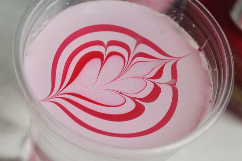 Сначала капают базовый светлый лак. Когда он растечется по максимуму, в центр круга отправляют каплю красного или розового. Снова ждем, чтобы он хорошо разошелся. Повторяем несколько раз, чтобы получилось три ярких окружности, а в центре светлое пятно.
