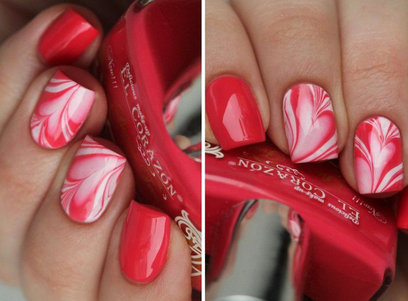 Любительницам красного лака придётся по вкусу водный маникюр с красно-белыми разводами. Можно выполнить его на всех ноготках или выделить только несколько, оставив остальные однотонными, в красном цвете.