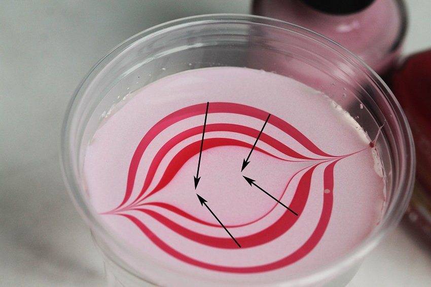 Зубочисткой проводим несколько раз по поверхности воды, чтобы создать будущую композицию.