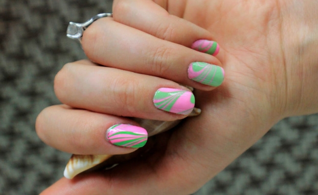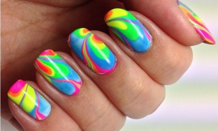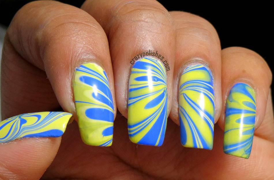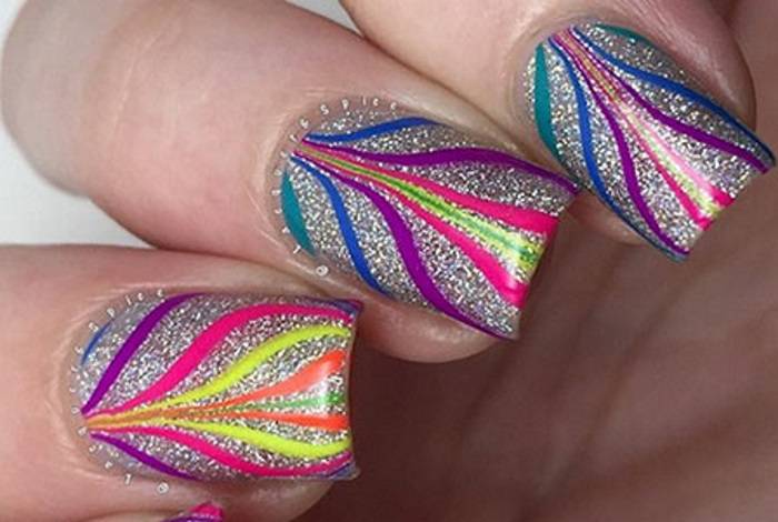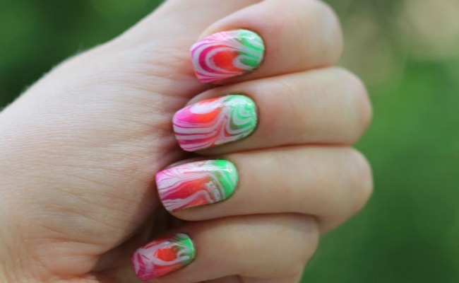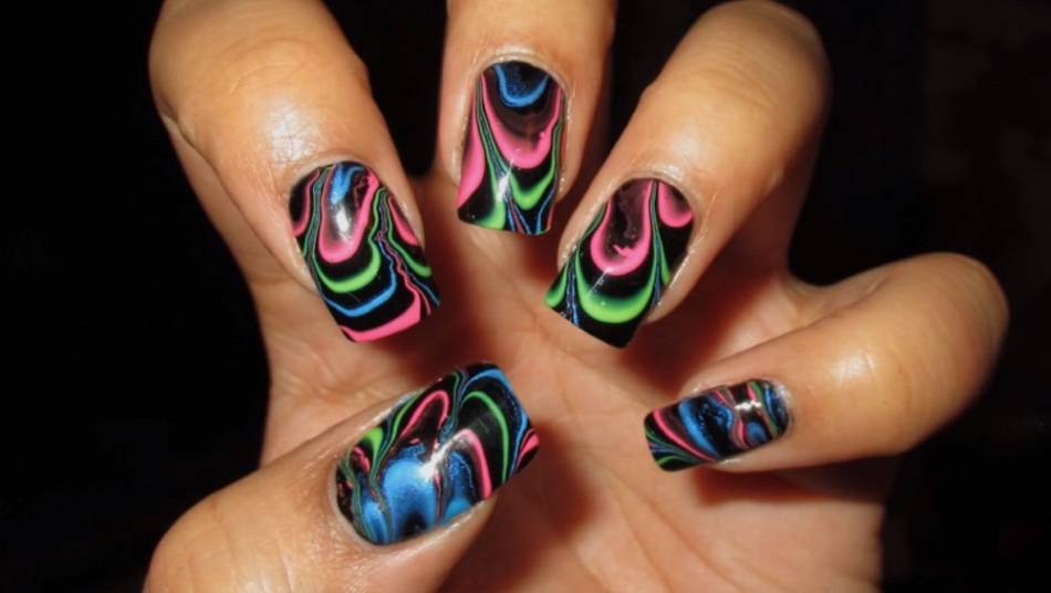 Яркие тона отлично подходят для водного маникюра. Чтобы такой дизайн, потребуется емкость, куда следует налить воду, иголка, лаки разных цветов и салфетка. Теплая вода наливается в стакан из пластика, далее туда следует добавить лак. Нескольких капель будет достаточно. После того, как он растечется в воде, в стакан капается пара капель лака другого оттенка.