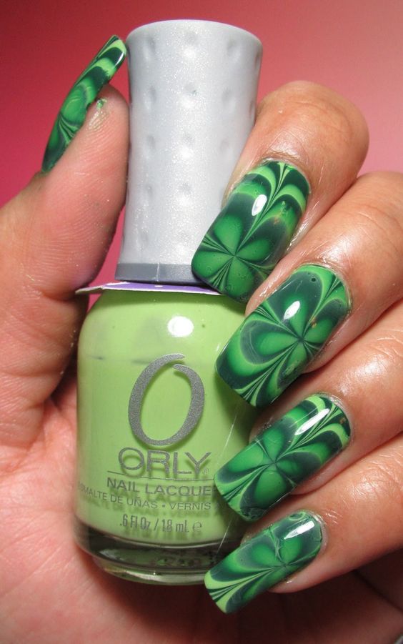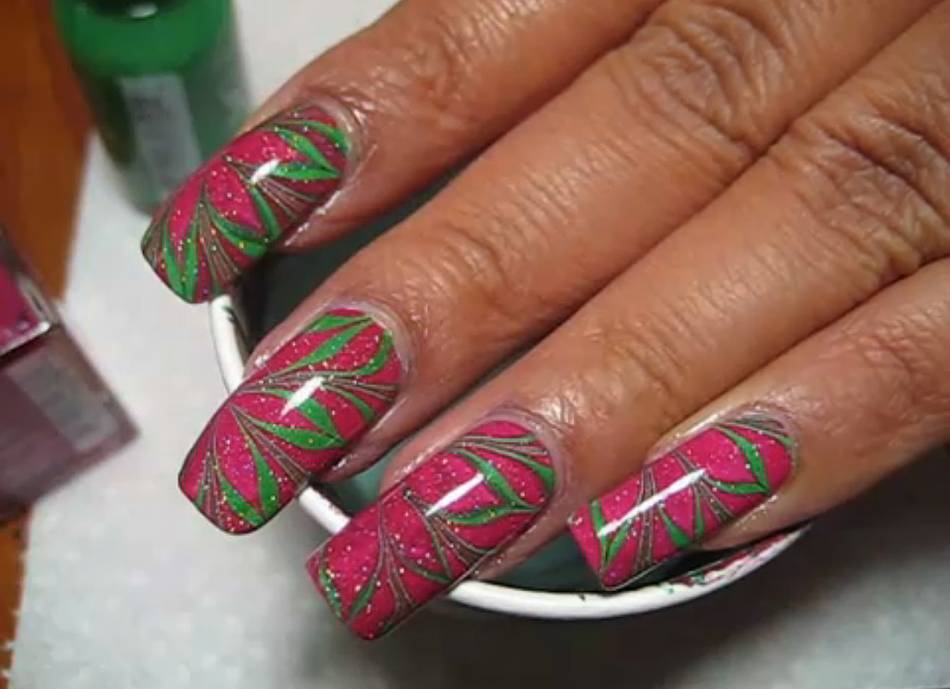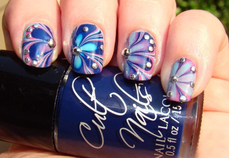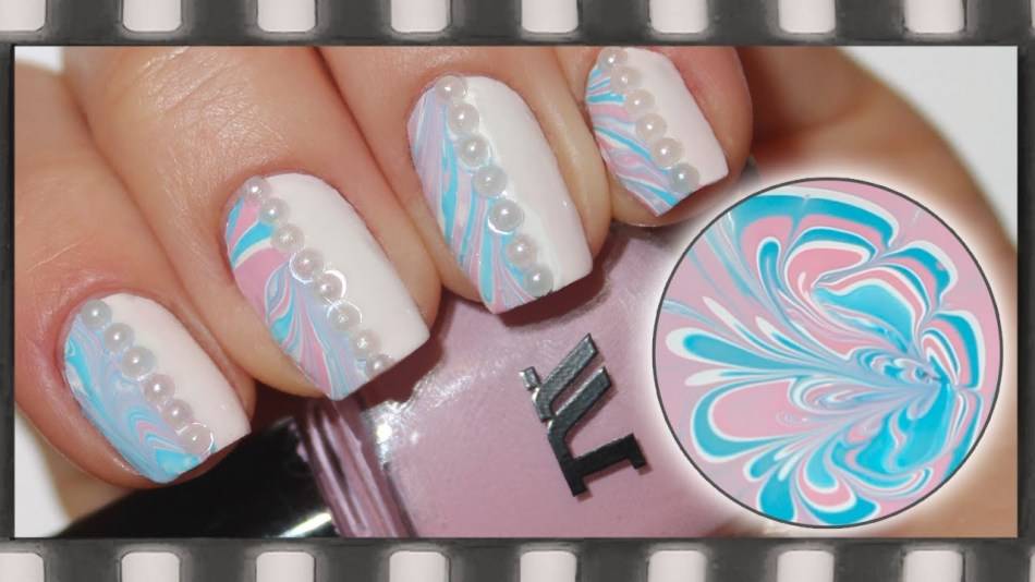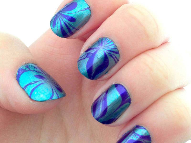 Водный дизайн заключается в том, что с помощью нескольких лаков и их свойства текучести в воде создается пленочка с рисунком, которая затем легко переносится на ногти.