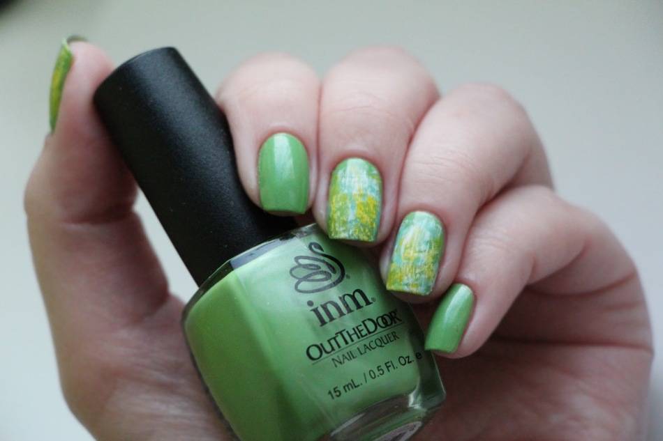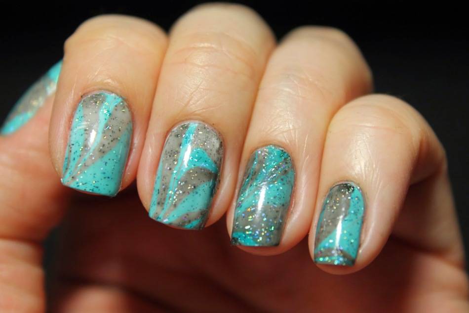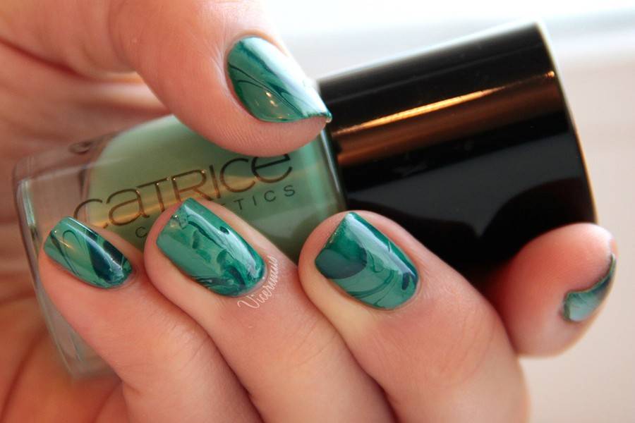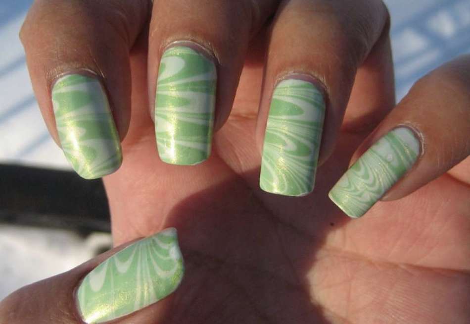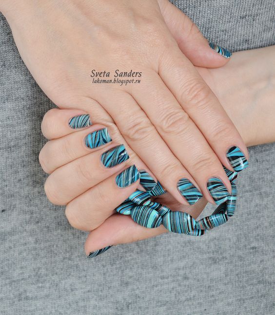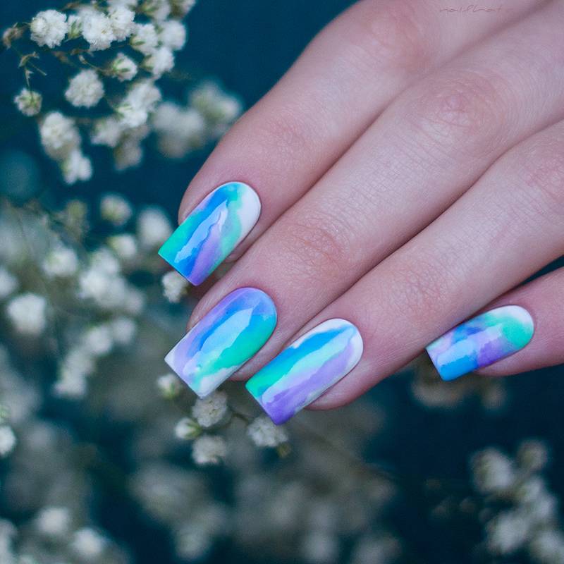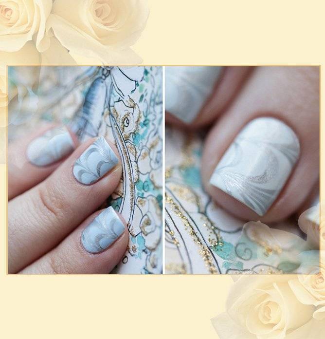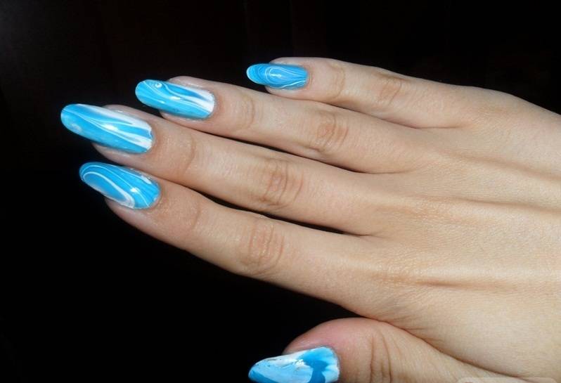Сине-зелёные разводы на белом фоне ассоциируются с морем, бассейном, напоминают о лете и вполне оправдывают название водного маникюра.