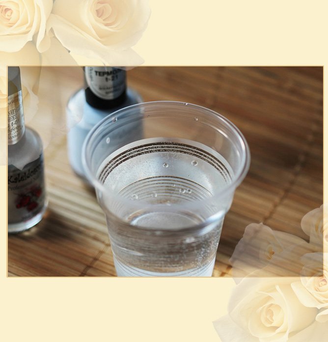 Для более экономичного расходования, желательно применять узкую посуду. Кроме этого, требуется использовать емкость с достаточной глубиной, это поможет избежать задевания ногтями краев и дна. Тогда ваш узор точно не смажется. Вода, приготовленная для выполнения водного маникюра не должна быть холодной, иначе лак растечется и застынет.