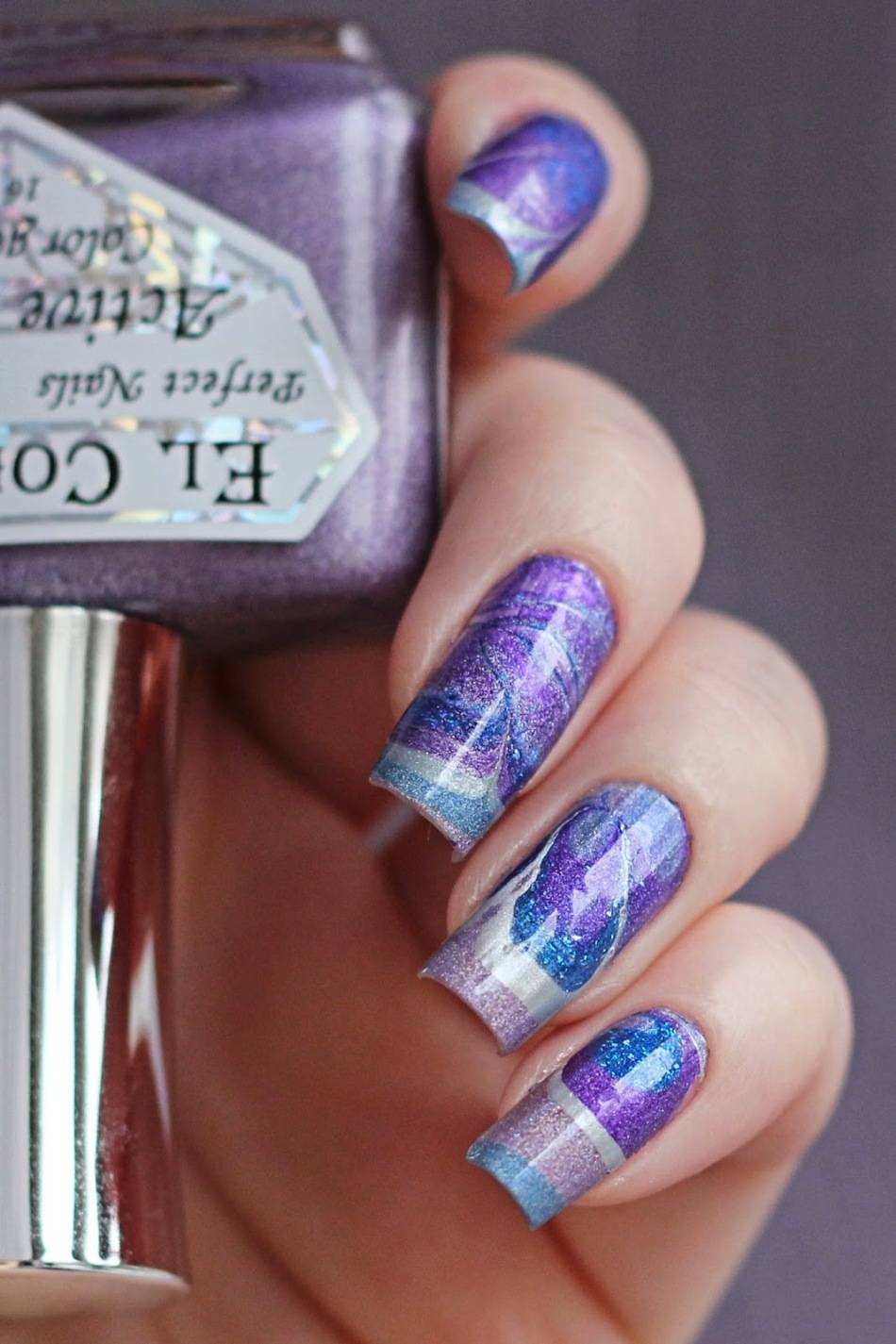 Чтобы получить водный маникюр как на данном фото Вам понадобятся: EL Corazon Charm and Beauty №858 (коралловый) и №881 (сине-фиолетовый), а также