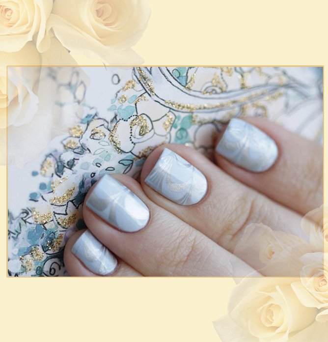 В начале данной веб-странички мы уже писали, что сочетания лаков для водного маникюра могут быть не только контрастными по цвету, но и близкими, а разными по текстуре. Примером тому служат фото – водный маникюр “Голубые дали”. Матовый кремовый светло-голубой лак сочетается с серебряным зеркальным. Помимо красивых узоров в этом маникюре есть и еще одна “изюминка”. Идин из лаков – термо. А это означает, что при смене температуры с порогом 29°С его цвет будет меняться от светлого до темно-голубого, каждый раз удивляя саму обладательницу маникюра и окружающих. Просмотрев пошаговые фото – водный маникюр “Голубые дали” от Натальи Мироновой, Вы с легкостью сможете его повторить в домашних условиях.