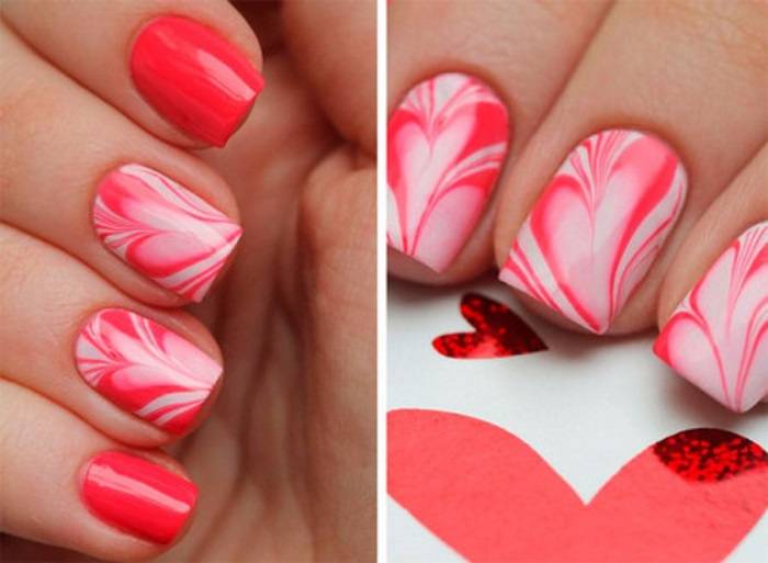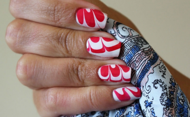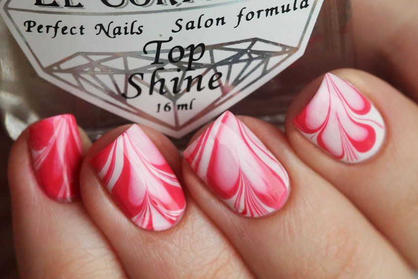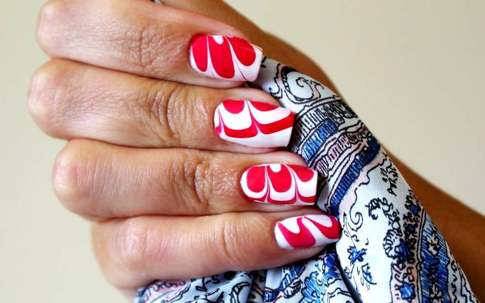 Любительницам красного лака придётся по вкусу водный маникюр с красно-белыми разводами. Можно выполнить его на всех ноготках или выделить только несколько, оставив остальные однотонными, в красном цвете.