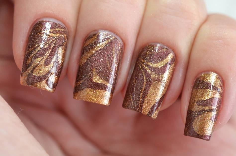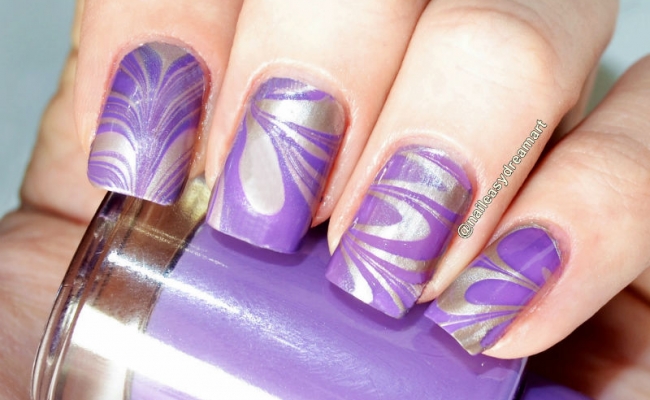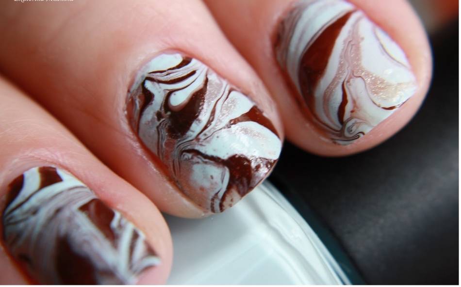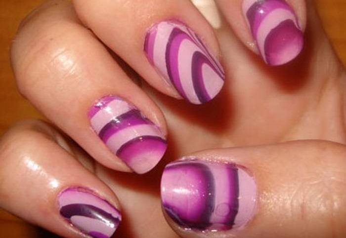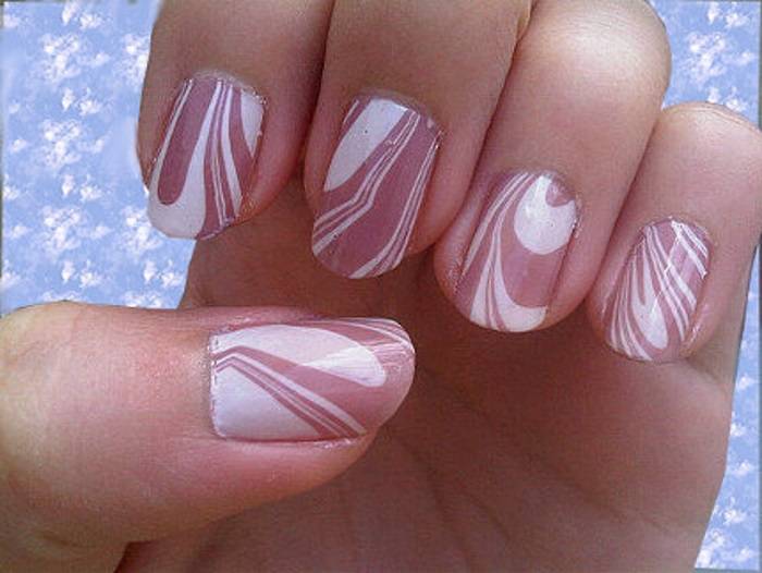 Оригинальные разводы на ногтях можно получить, не опуская пальцы в воду. Такой вариант позволяет расходовать меньше лака, не требует дополнительной защиты кожи вокруг ногтей, а также значительно сокращает время маникюра.