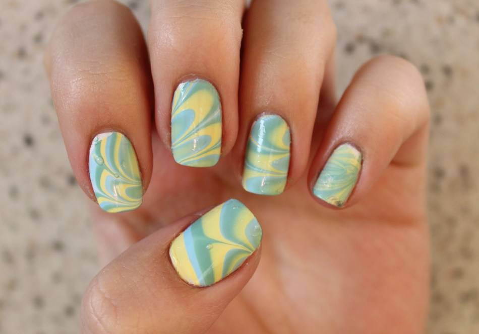 В качестве неброского варианта отлично подойдёт водный маникюр в спокойных пастельных тонах