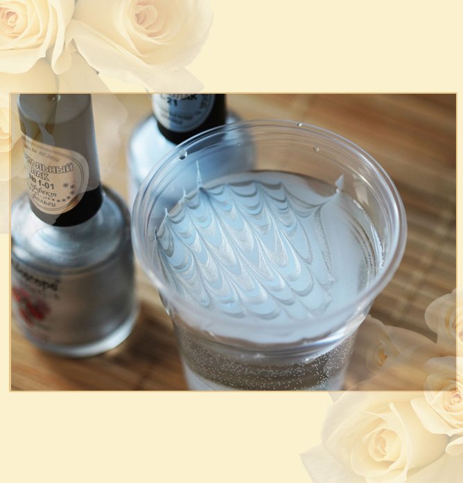 - После того, как рисунок будет готов, оставить его в воде до образования плотной пленки. Требуется подождать около 5-10 минут. Чем дольше лак находится в воде, тем плотнее будет пленка.