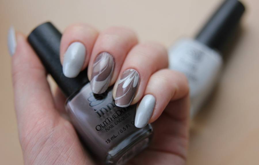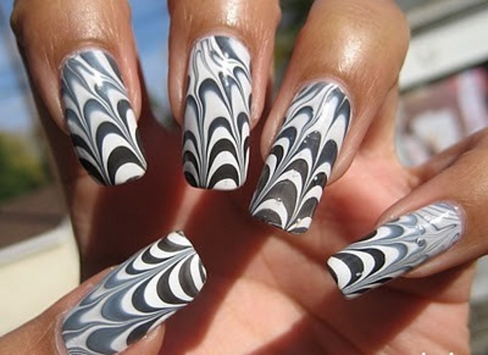 Для того, чтобы водный дизайн удался, необходимо использовать свежие лаки и наносить их в воду по одной капле – сначала один пигмент, затем другой, по желанию третий и четвертый. Рекомендуется использовать 2-3 оттенка, максимум 4. Для создания черно-белого дизайна понадобится всего 2 цвета и 5-6 капель, которые накладываются на воду по очереди.