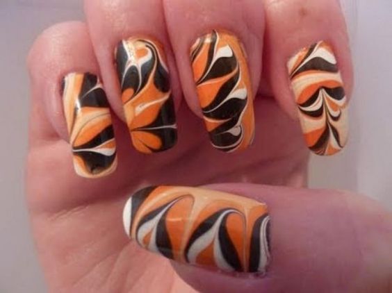 Водный маникюр выполняется с помощью жидкости и позволяет создать самые оригинальные узоры на поверхности ногтевой пластины. Этот тип покрытия часто называют мраморным маникюром за возможность отображения структуры натурального камня в дизайне, однако не всегда женщины предпочитают носить «скучный мрамор» и выбирают оттенки поярче. Дизайны водного маникюра подходят для ногтей любой длины и формы, большую роль играют выбранные оттенки – они должны сочетаться между собой или создавать стильный контраст.