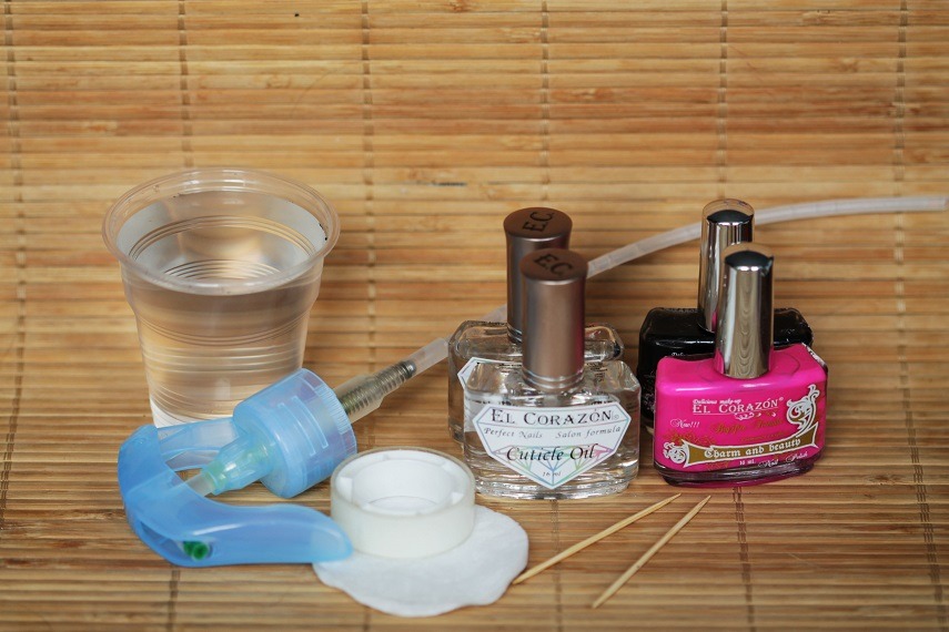 Сначала делают по классической схеме маникюр, нанеся базу, после ее высыхания — розовый цвет. Далее в стаканчик наливают черный лак. Теперь необходимо выполнить очень интересную процедуру.